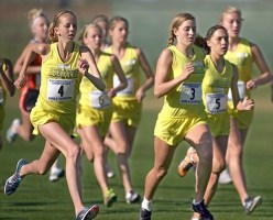 Aberdeen Central’s Courtney Neubert (4) and Hannah Kastigar (3) lead their teammates near the start of Saturday’s ESD cross country meet at Lee Park Golf Course. In the background are Morghan Waage, Sydney Waterman, behind Waage, Kaitlyn Volk (5) and Brynn Flakus, behind Volk. photo by john davis taken 10/9/2010