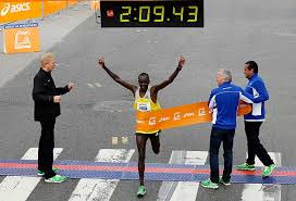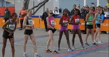 As Duliba continued to front the women’s race, Ethiopia’s Shuru Diriba remained in third, Kastor in fourth.  Tucking in behind the rookie Duliba, Zemzem Ahmed’s ran her own debut last fall in Frankfurt, 2:27:16.  Diriba’s best was notched in Dubai 2009 at 2:28:26.  Behind them Deena Kastor had rediscovered her rhythm in fourth and began to eat into the gap to third.