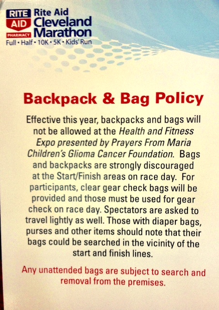 Cuyahoga County Sheriff Frank Bova told WKYC-TV3 that this year they had a new “impact unit” in the crowd for the marathon, a unit made up of 12 deputies who were ready for a large-scale emergency response. And at the weekend expo at Cleveland’s International Exposition Center, a new bag policy was implemented that had officers checking every purse and backpack that came into the building, and required all backpacks to be checked before entering the expo area. Is widespread TSA-screening the world of the future in the land of the free?