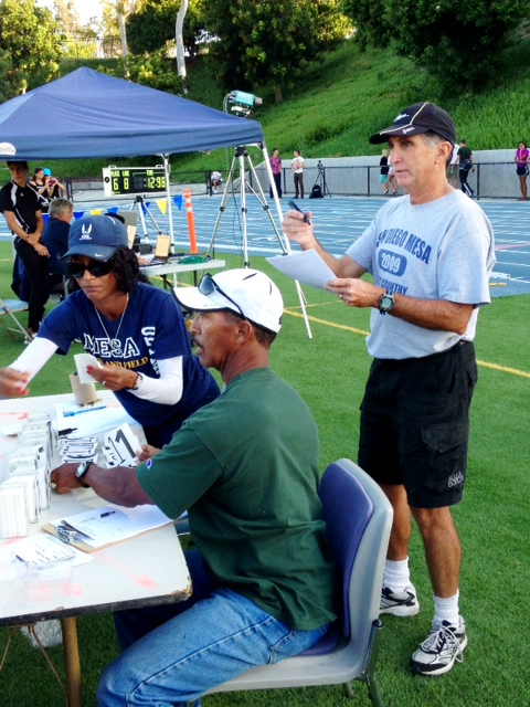 But don’t blame meet organizers Thom Hunt and Monique Henderson, both of whom coach at Mesa. They, along with Monique’s dad, Adam, worked tirelessly handing out hip numbers, lining up fields, and wiping noses.  With so many kids, teens, and adults on hand looking to compete — heck, the 100 meters heats alone took nearly 30 minutes to complete — you knew it was going to be a late night.  All of which was a good thing as the popular Summer Nights series continues to build track and field in America’s Finest City.