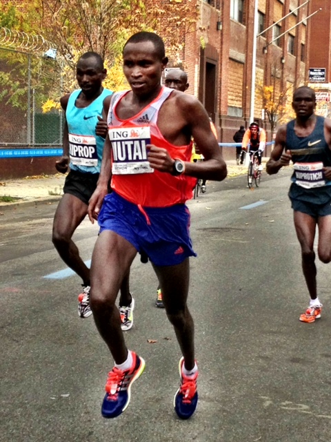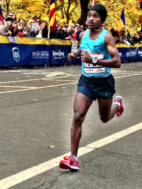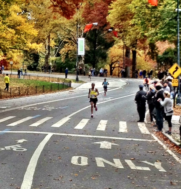 Entering Central Park at 90th Street – 24 miles. The man who had one of the best marathon years in history in 2011, with unimaginable course records in both Boston and New York, followed with an off 2012… He dropped out of Boston’s roasting oven in April, which cost him a spot on the Kenyan Olympic team for London, and he was Hurricane Sandy’d out of defending his NY title last fall… This spring in the Virgin London Marathon he was never a factor in a last-man-standing win by Tsegay Kebede. Mutai dropped out with a hamstring issue.  But since then he has been back in full form, and when that happens, no contest, really.