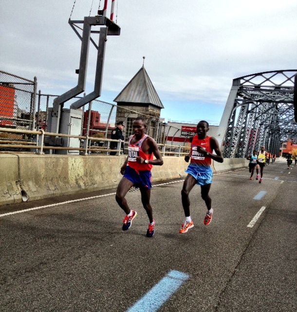 Kebede & Uganda’s Jackson Kiprop in lock-step onto First Ave. up Thunder Alley.