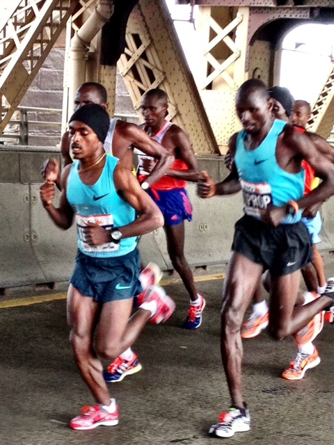 Peter Kirui leads a 5:27 opening mile to the crest of the Verrazano Narrows Bridge.  Joining in the middle is 2009 champion Meb Keflezighi and 2011 course record setter Geoffrey Mutai (in red) as they carve out a 4:40 second mile down onto Brooklyn’s Fourth Avenue.  All the while the scourge of a north wind whips at their singlets at the left front shoulder, flags stiff from the northwest on the north running course.  My moto driver Sean Ricci has heated pants and jacket. Smart fellow.