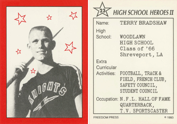 Remember that both Terry Bradshaw, four-time Super Bowl winning quarterback of the Pittsburgh Steelers in the 1970s and Russ Francis, former All-Pro tight-end for the New England Patriots and San Francisco 49ers, were high school javelin record holders. Bradshaw attended Shreveport, Louisiana’s Woodlawn High School where he set a national record at 245 feet (74.68 m). Francis attended Pleasant Hill High School in Oregon where he broke the national high school javelin record in 1971 at 259 feet, 9 inches. And in what is recognized as the ultimate high school record, former S.F. 49’er Michael Carter still holds the all-time high school record n the Shot Put at 81′ 3 1/2″ (24.78 meters). Carter set this mark at the 1979 Golden West Invitational (Sacramento, CA) while competing for Jefferson High School of Dallas, Texas. No high school athlete has come within four feet of this record since.