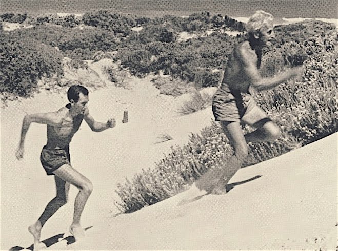 Percy Cerutty leads Herb Elliott up the sand dunes of Portsea