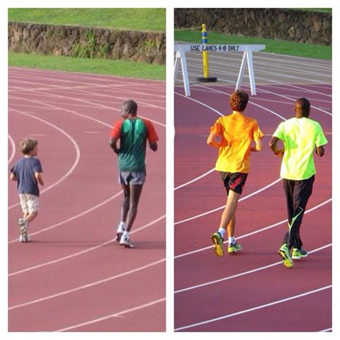 After the session was finished and a final series of pictures snapped, Mbarek and Sebastian Barahal walked up campus to Punahou’s eight-lane all-weather track to recreate a photo they’d first taken in 2004 when Sebastian was just a tot. On the way they past the Waterhouse Pool where the raucous cheers of the Punahou faithful were rising up from the seats alongside the deck.
