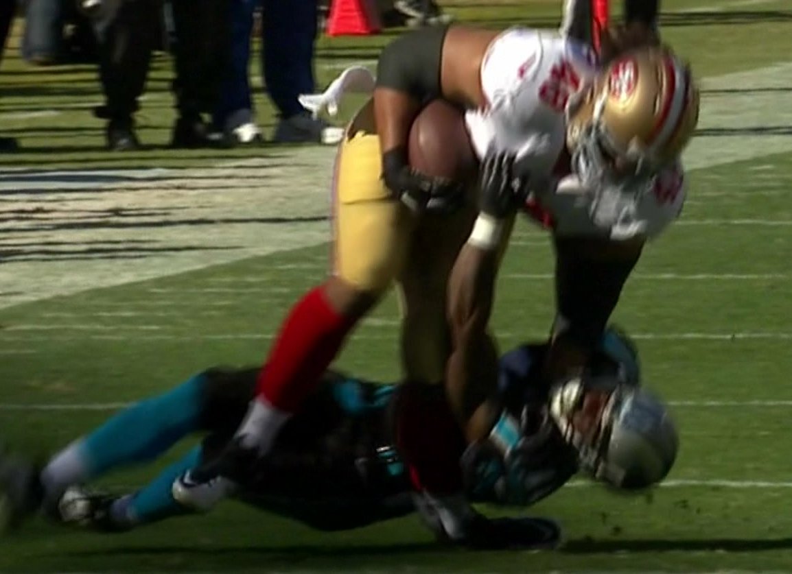 On their first possession in last Sunday’s NFC Divisional round playoff game against the hometown Carolina Panthers, 49er QB Colin Kapernick threw an outlet pass into the right flat to his 6’4”, 293 pound running back Will Tukuafu. Closing from his cornerback position came 5’11”, 195 pound Captain Munnerlyn.