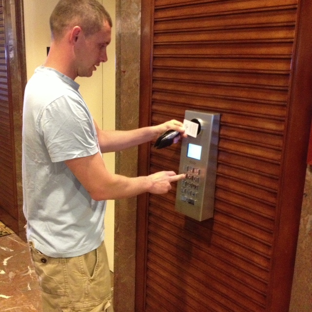 You see, the elevators at the hotel presented something new. The operations weren’t controlled by UP and DOWN selectors on the outside and FLOOR buttons on the inside. Instead, you had to hold your room key card along a surface pad outside, then punch in your floor. From there the pad told you which of the A, B, or C elevators would open for you to ride. Once more the need for human input had been reduced as inside the elevator, there was no key pad whatsoever other than DOOR-OPEN, DOOR-CLOSE buttons.