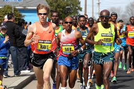 *Under excellent conditions  – low 40F temps and a light SSW tailwind at the start – the  women’s took full advantage, whipping out of Hopkinton like the men did in their record year 2011.  Three years ago under even more salubrious conditions Ryan Hall pranced to the front and kick-started the field onto record pace: 4:38 for the first mile, 4:36 for the second, 4:39 for the third. Once rolling the pace never slackened on the way to Geoffrey Mutai’s spectacular 2:03:02 finish. Hall took fourth in 2:04:58.