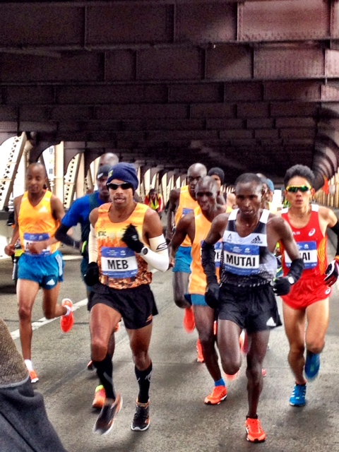 Motoring toward the Willis Avenue Bridge at 20 miles Wilson Kipsang led Mutai, Lelisa Desisa of Ethiopia, Meb, Stephen Kiprotich, Gebre Gebremariam, Lusapho April, Peter Kirui, Micah Kogo, and Michael Kipyego back up to Imai and then past him as the big favorites began clearing their decks for action.