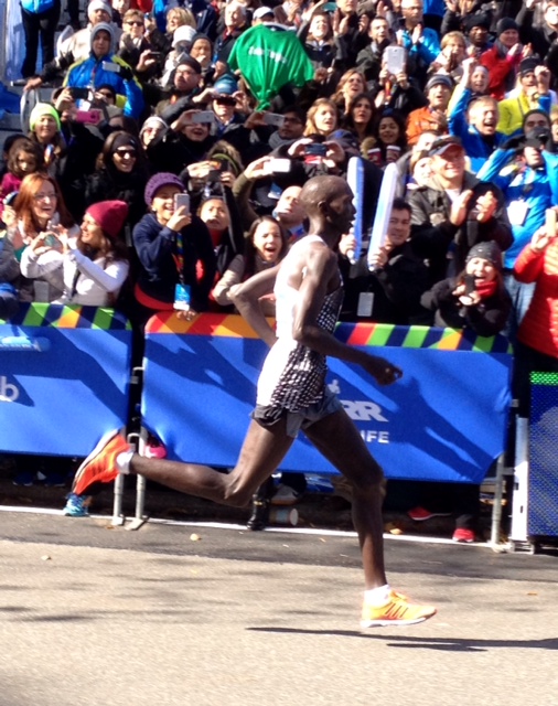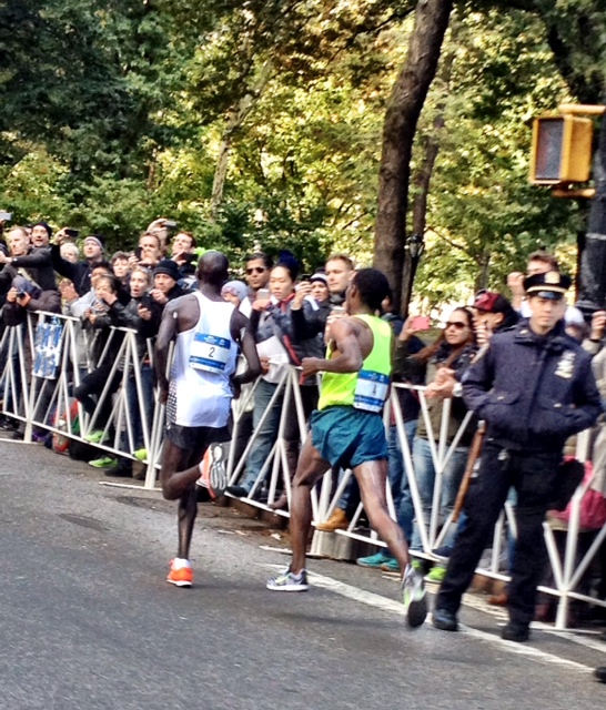 Central Park South was lined with fans massed beneath world famous hotel towers whose cost for the weekend might well have been more than the average Kenyan’s yearly salary.  No time for such calculations though, as a right turn led Kipsang and Desisa into Columbus Circle before reentering them to the park for the final stretch. Though slightly smaller than previous years due to the chilly conditions, the crowd of New York fans was just as boisterous as ever.  The sound was deafening as the two racers came up alongside our bike.
