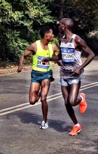 Though his attempts to put away Desisa were showing no gain, Kipsang remained placid, almost dismissive as he reloaded his chambers.  He had bored out his weaponry with extra speed work during this training session, he told me, and now he was hoping there was enough ammo in his clip to fire him to victory.  Again, it was all or (virtually) nothing for the ex-world record holder who had seen his record fall in Berlin in September. He needed today’s win to secure the $500,000 World Marathon Major Series bonus and New York’s $100,000 first prize.  Second place would gain him only $60,000, fully 10X less than victory.