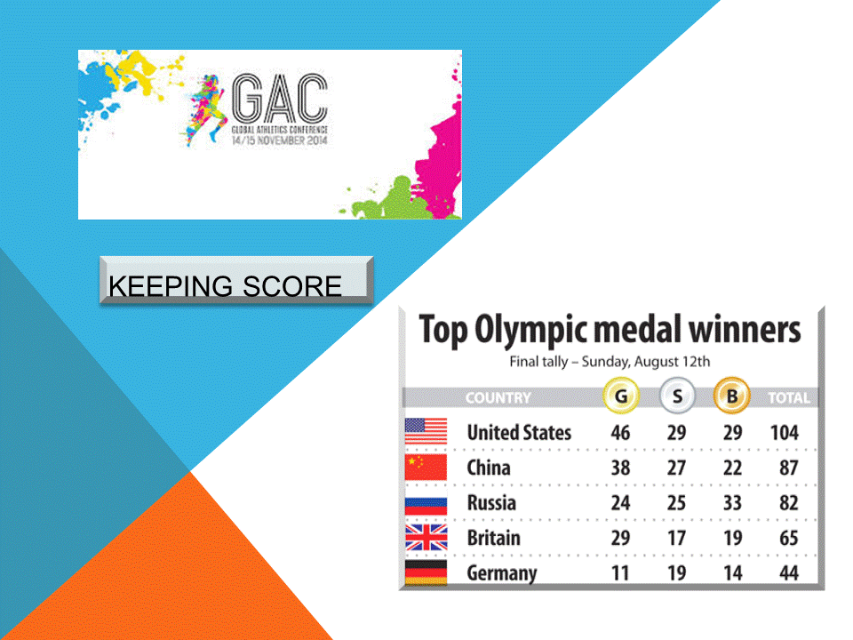 Standings listing which countries have won the most medals. Even in the Diamond League points are awarded in each Diamond event through the season — so, in that sense, there is a connection within each event, though not across any collection of events. But then, look how each event is staged. Everything above the 400m has pacesetters, even the Finals, meaning time is given primacy over competition. And it is the same in most of the world’s top marathons. But if the Boston Marathon had been a paced race, Meb Keflezighi would not have been the first American champion in 31 years, and the sport would have been the lesser for it.