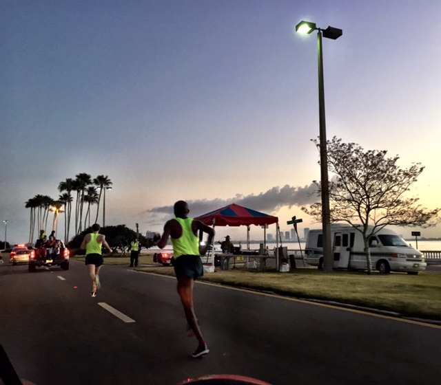 After Dathan had broken away from Abdi at ten miles I could hear one of the outbound runners shout out across the median strip along Bayshore Boulevard, “Ritz is back, baby!” Yep, that seems to be the case.