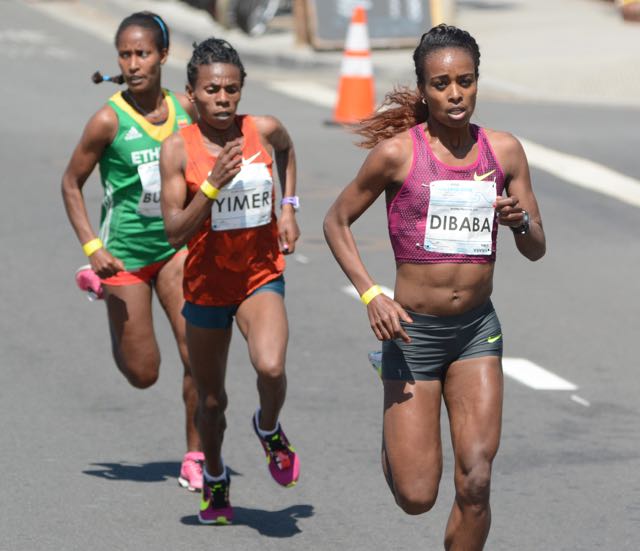 But with a the new course featuring an upgraded opening 270 meters, a U-turn, and that brisk off-shore wind, a controlled 4:36 mile was too much to ask. Instead, the women passed the mile in 4:51 at which time Lipari exited the scene, leaving Dibaba fronting 2013 Carlsbad champion Gelete Burka and 2009 World Championship bronze medalist at 10,000m Wude Yimer — all of Ethiopia. Last year’s runner-up Betsy Saina of Kenya fell behind in fourth leading the chasers.