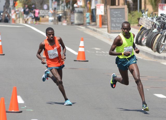Wilson Too is a new comer to the U.S. road scene. He has a best of 13:47 on the track over 5000m and a road PR of 27:36 for 10K,neither of which would lead one to believe he would challenge for the 2015 CBAD win. But such is the nature of racing, and it wasn’t until the final stretch down Carlsbad Village Drive that Lalang’s victory was assured.