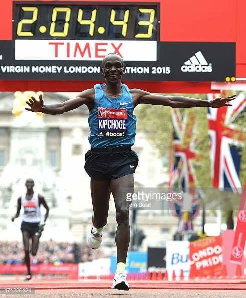 Just as in Chicago last October, Eliud Kipchoge’s lips split wide as he powered away from his final challenger today in the British capital. Last fall Sammy Kitwara fell victim. Today it was defending London champion Wilson Kipsang, the only man to defeat Kipchoge to date over the marathon distance (2013 Berlin when Kipsang ran a world record, since broken, 2:03:23, while Kipchoge finished second in a PR 2:04:05).