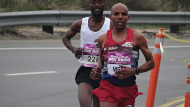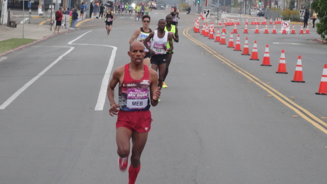 San Diego, CA. — A minor controversy attended Meb Keflezighi’s introduction to the master’s category today at the 18th Suja Rock `n Roll Marathon & Half-Marathon. Though Meb won the USATF Master’s Half-Marathon championship, and established two U.S. road records along the way, he was out-kicked in the final 100 meters by 27 year-old Zambian native Jordan Chipangama who trains out of Flagstaff, Arizona, 62:27 to 62:29.