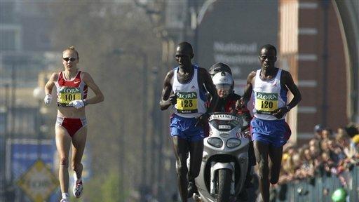 But London 2003 was a slightly different matter. There the two Kenyan men were sometimes off to the side, other times running right in front of Paula, though they might not have not been running at a predetermined pace.