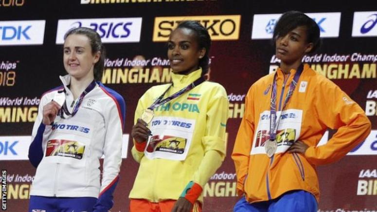 Laura Muir (l) and Sifan Hassan (r) bracket 1500 & 3000 gold medalist Genzebe Dibaba at World Indoors   (Getty Images)