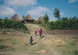 Conical thatch-roofed mud huts called tukuls, common in the countryside of the Arsi region, sat bunched some 100 meters off the road atop this pearl in the string of surrounding mountains. The valley below spread for miles upon miles, a misty washed-out hew of brown grassland partially covered in scrubby bush and accented by airy-topped Acacia trees.