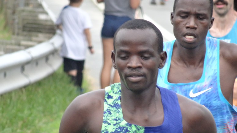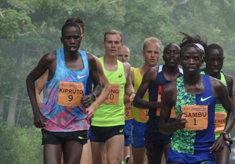 Leonard Korir opens his lead in the final mile over Sambu.Korir turns Falmouth Harbor heading toward mile six.1983 Boston Marathon champ Greg Meyer watches the action near six miles with 1978 Falmouth runner up Mike Roche.Passing six miles in 27:30 off a 4:40 split.The final stretch with 1K to go at the turn.Korir salutes the crowd.Victory awaits!How the followers saw Leonard at the line.4X champ Sambu holds off Cheserek for second 32:29 to 32:30.Former Michigan Wolverine Mason Ferlic In fourth in a breakthrough performance.Sailing home!Falmouth board member Scott Ghelfi interviews the champion.To the victor go the spoils.Everyone’s destination.The ball field was jammed!Former Philadelphia Half Marathon race director Tony DeSabato with 1980 Falmouth Road Race champion Rod Dixon in the Crow’s Nest.The calm before The storm in Woods Hole.Lined up and ready to go.Nerves apparent before the start.And they are off.2014-2017 champ Stephen Sambu attack’s early out of Woods Hole.Sambu in close concentration with Silas Kipruto already chalkenged.Mike 1 in 4:27, 7 seconds faster than last year.No prisoners today.In mile 2, Cooper River Bridge 10K champ Silas Kipruto made his bid.Kipruto put some distance on the pack in the second mile.The gap widens.Three-time Bix 7 champion Kipruto finished fifth at the Wharf to Wharf six miler in Capitola, California two weeks ago.Famous Nobska LightRolling hills and tree cover define the first 3 miles of the Falmouth course.2 miles in 9:03, a 4:36 second mile. Silas still leads but the pack is closing.Together again. Kipruto, Korir, Sambu, David Bett and King Chez.No messing around. Sambu again goes to the front and puts in the boot.Serious business.Edward Cheserek In his first Falmouth race came in with a slight hamstring pull from 10 days ago after running a 13:04 personal best over 5000 m in Belgium. But in mile three he fades from the front as the pack strings out under the pressure applied by four-time champion Sambu.Sensing the moment at hand, Sambu continues to drive with only Leonard Korir and Silas Kipruto able to maintain contact.Mike 3 in 13:39, a 4:36 split and it’s Just the two Falmouth veterans still in the hunt.Gaps have formed.Sambu finished fourth and Korir third last year as they let University of Michigan 10,000 m NCAA champion Ben Flanagan from Canada hang around until his speed took the victory. This year it was a drive from the start.Big boisterous crowds lined the route along the beachSambu never came off the gas. But he couldn’t break free. He’s training for the New York City Marathon in November and coming off fourth place finishes at the Utica Boilermaker 15K and the Bix 7, and a seventh place at the Peachtree Road race July 4th in Atlanta.Beginning to show signs of wear.Four miles passed in 18:12 off a 4:32 split. Sambu wonders where Cheserek is.King Chez we gathered him is only 14 seconds behind at 4 1/2 miles.Finally, Leonard Korir takes control.Korir check his watch and sees that he passed 5 miles in 22:50 off a 4:37 split. In 1978 Bill Rodgers, Mike Roche, Craig Virgin, and Alberto Salazar passed 5 miles at 22:40 as Rogers headed toward his third Falmouth win with Roche in second, Virgin in third and Alberto fading back to tenth heading toward an ice bath to reduce his spiking body temperature. This year, Korir cruised to his first Falmouth victory in the final two miles. Thanks for taking the ride with me on the men’s lead vehicle along with 2018 champion Ben Flanagan provided color commentary like a real natural. See you down the roads.