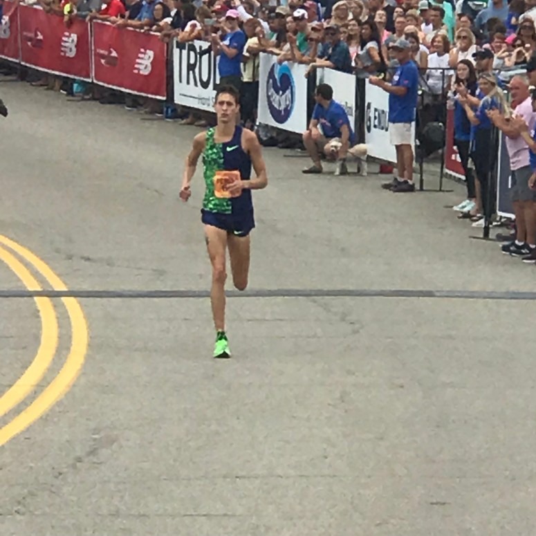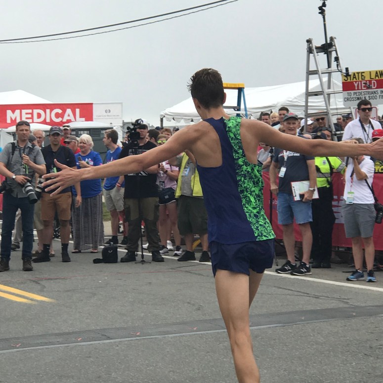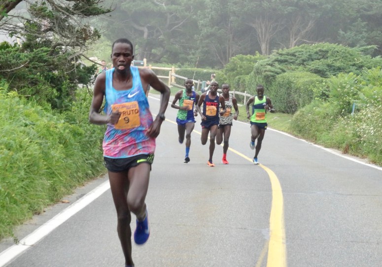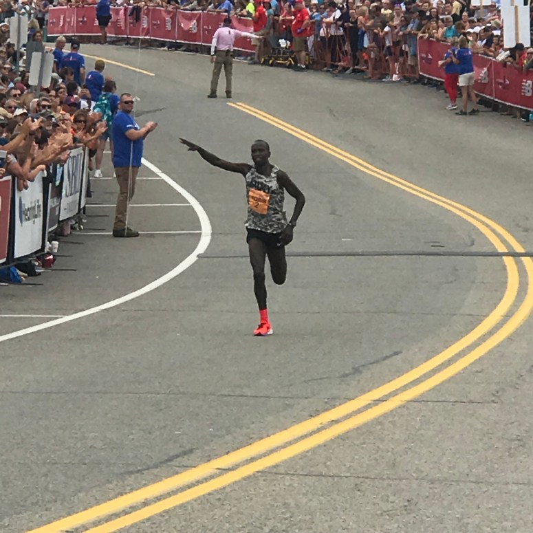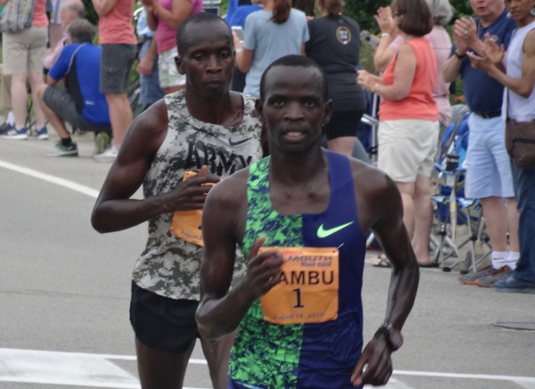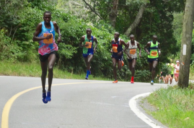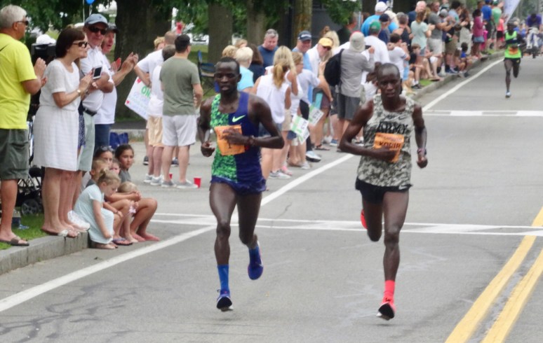 Falmouth, MA. – Pictures from the lead man’s vehicle at the 47th New Balance Falmouth Road Race on old Cape Cod. U.S. Army’s Leonard Korir (32:11) wins his first Falmouth after finishing second twice and third two other times. Four time champion Stephen Sambu of Kenya takes 2nd (32:29) with fellow Kenyan Edward Cheserek in his his first Falmouth taking third (32:30) and former NCAA steeplechase champ Mason Ferlic out of Michigan in 4th (32:54) on a warm, muggy morning.