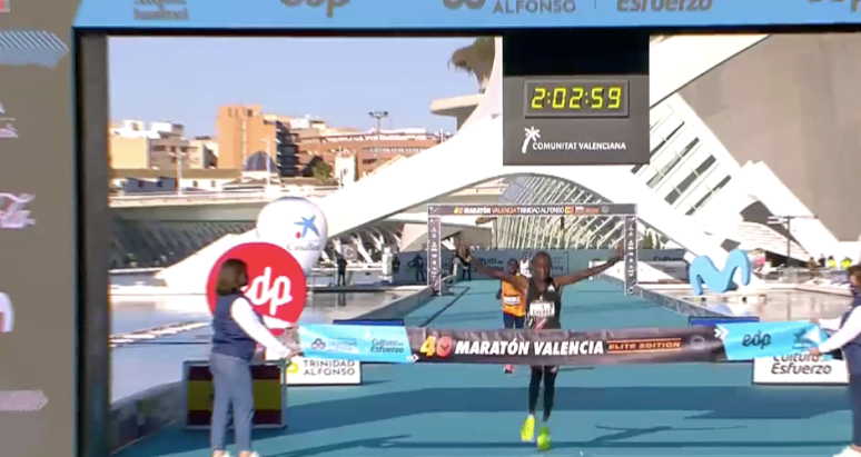 And finally, while the Valencia Marathon produced a staggering 30 sub-2:10s yesterday, it also produced 77 sub-2:20s, coming tantalizingly close to Boston 1983’s total of 83. But even more tellingly, six of those 77 sub-2:20’s in Valencia were run by women! Leading the way was Kenya’s Peres Chepchirchir in 64th place overall in 2:17:16. For comparison’s sake, Joan Benoit (Samuelson) ran a 2:22:43 world record in Boston 1983, finishing in 121st place overall.