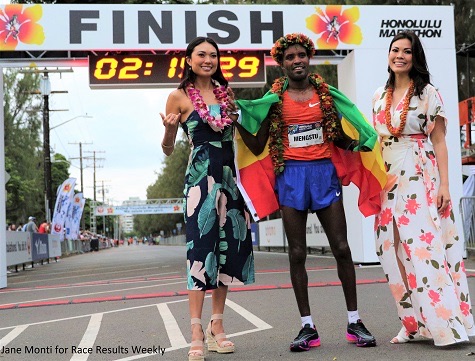Up front, 34-year-old Asefa Mengstu of Ethiopia snapped Kenya’s 14-year stranglehold on the Honolulu Marathon men’s title, pulling free of fellow, 2:04–marathon man Barnabas Kiptum of Kenya in mile 22. It was only the second Ethiopian men’s title in Honolulu history, adding Mengstu’s name to that of Ambesse Tolosa who became Ethiopia’s first and, to date, only Honolulu Marathon champion in 2006.