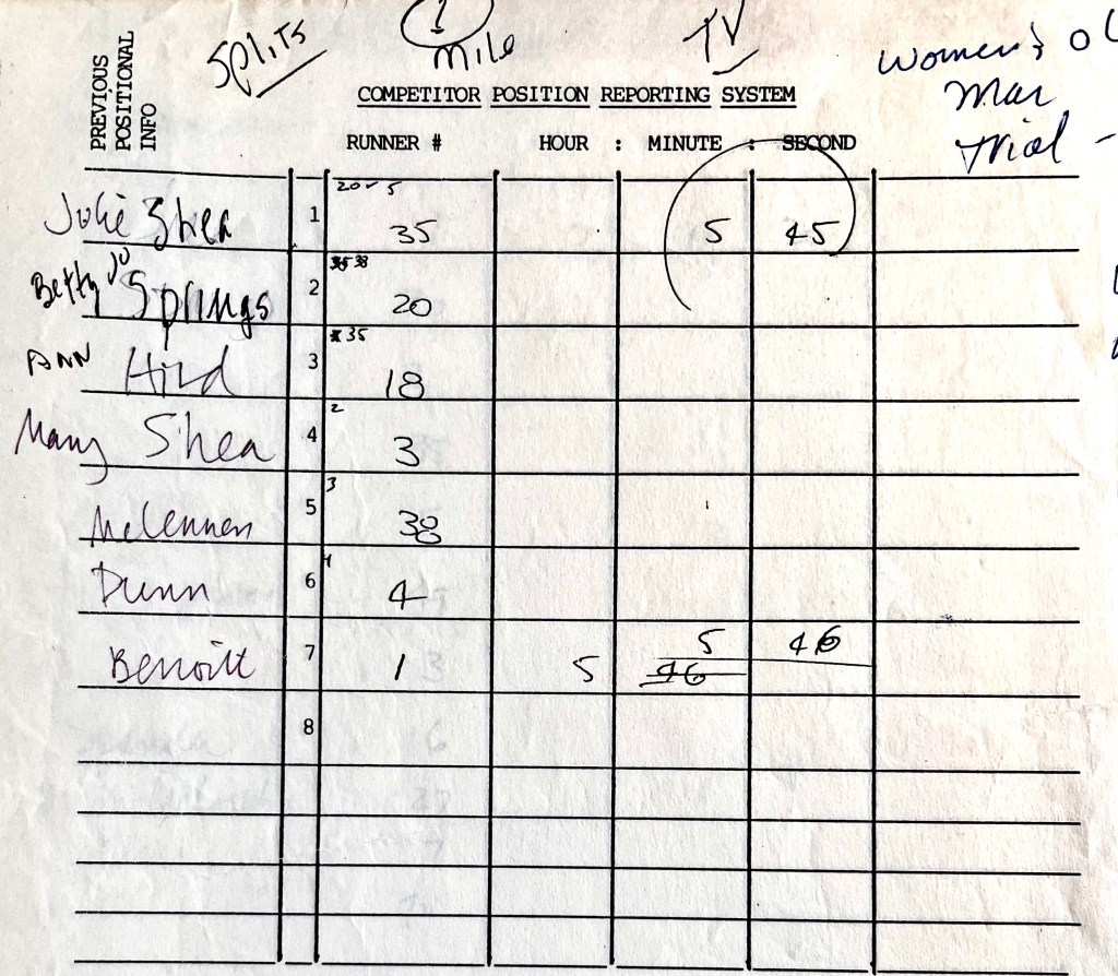 Great memories from this event! I served as a course volunteer, monitoring driveways out around mile 20. After hours of inactivity, I remember the excitement building, first as the helicopters flew overhead…then waves of motorcycle cops cresting the hill…followed by Joanie herself, legs pumping like pistons in that compact style of running she had, motoring by with no other runners in sight. Still gives me goosebumps when I think about it – one of my all-time top sports memories.