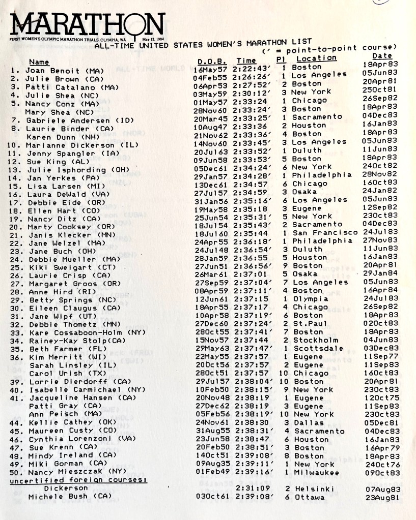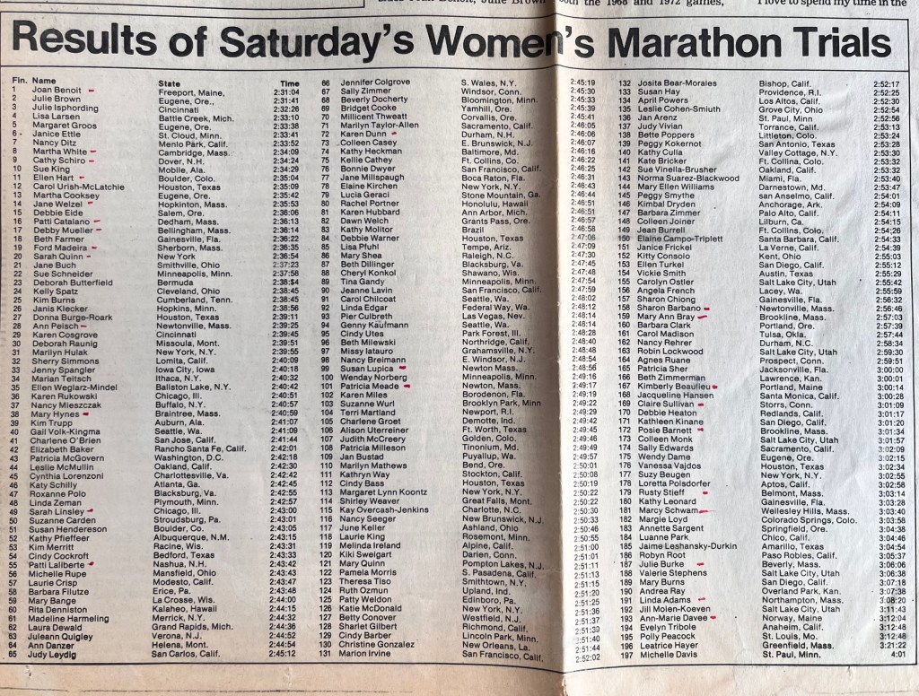 The race led to the inaugural women’s Olympic Marathon in Los Angeles on August 5. Another race famously won by Maine’s Joan Benoit, who later that fall would marry Scott Samuelson.