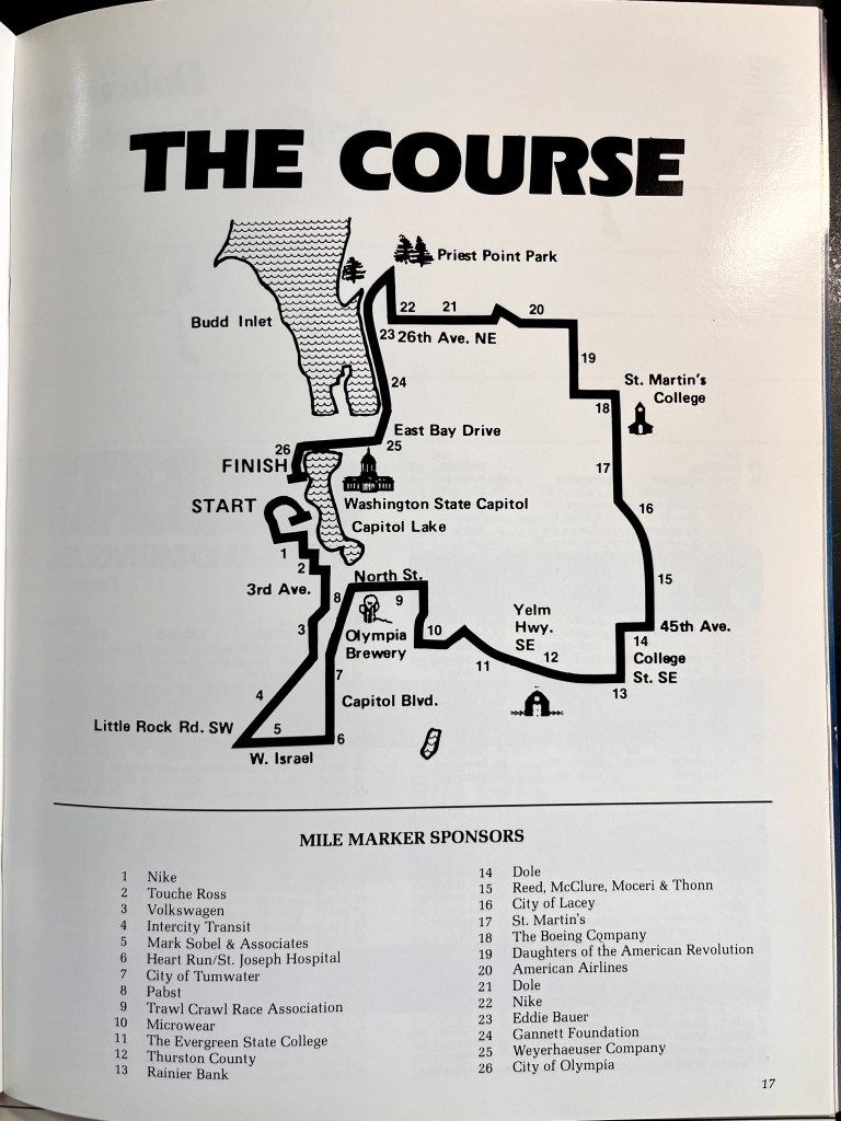 The city of Olympia was a wonderful host. Dole was the major sponsor. Brent James, partner of Super Jock ‘n Jill, one of Seattle’s oldest running stores, was executive director.