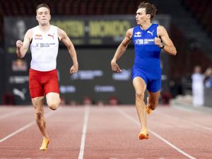 Mondo (in blue) over Karsten in Zurich 100-meter exhibition