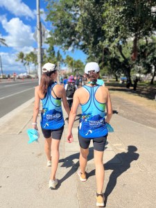 Those two stay together until Diamond Head when, at the 39 km mark, at the aid station Tuei seemed indecisive, unsure how to go to the table and almost ran into it before coming around the table to get her drink. But then she failed to grab it, whereas Cynthia easily snatched her bottle and kept on truckin’.