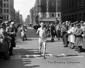 “I ran the race in 1932 for the second time. And I was with the leaders at Wellesley when I dropped out with blistered feet. The following year I was ill with the flu and finished in 37th place in 3:03:56. But at least I finished. The next year, I was a surprise second to Dave Komonen of Canada in 2:36:50.