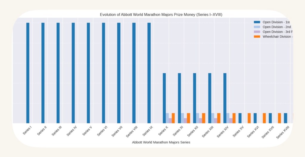 When the original five Abbott World Marathon Majors (AWMM) began in 2006, they awarded $500,000 to series winners, and continued from Series I to IX. But then, they reduced the prize to $250,000 in Series X, 2015–2016) before cutting it to $50,000 for Series XIV, 2021–2022, while adding a $50,000 Wheelchair division to foster inclusivity.