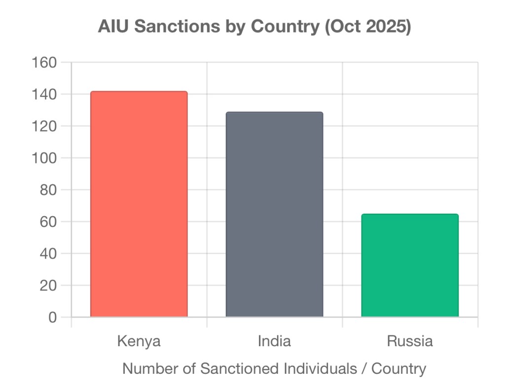 As of October 2025, the Athletics Integrity Unit’s global list of ineligible athletes stands at 675 names. Kenya leads with 141, followed closely by India at 129.