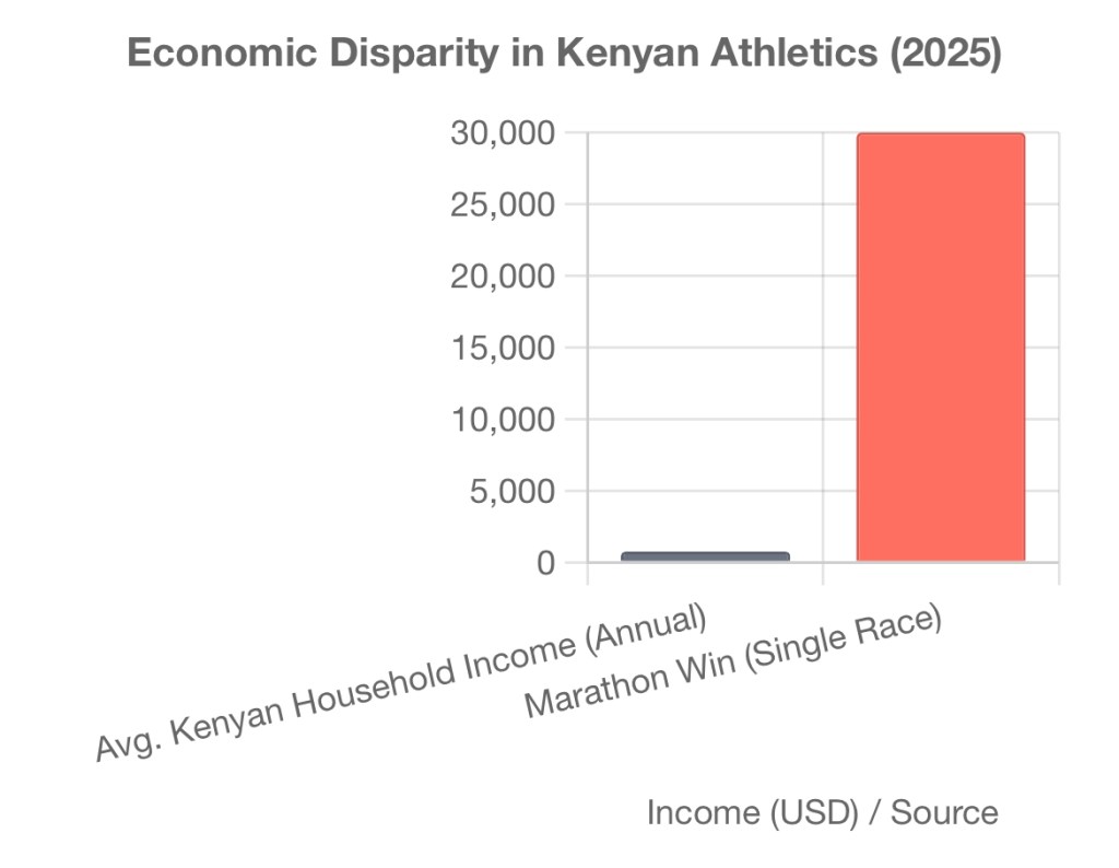 A local race purse of 100,000 to 300,000 Kenyan shillings (about $750 to $2,200) equals one to three years of family earnings. A $30,000 marathon victory can transform a life.