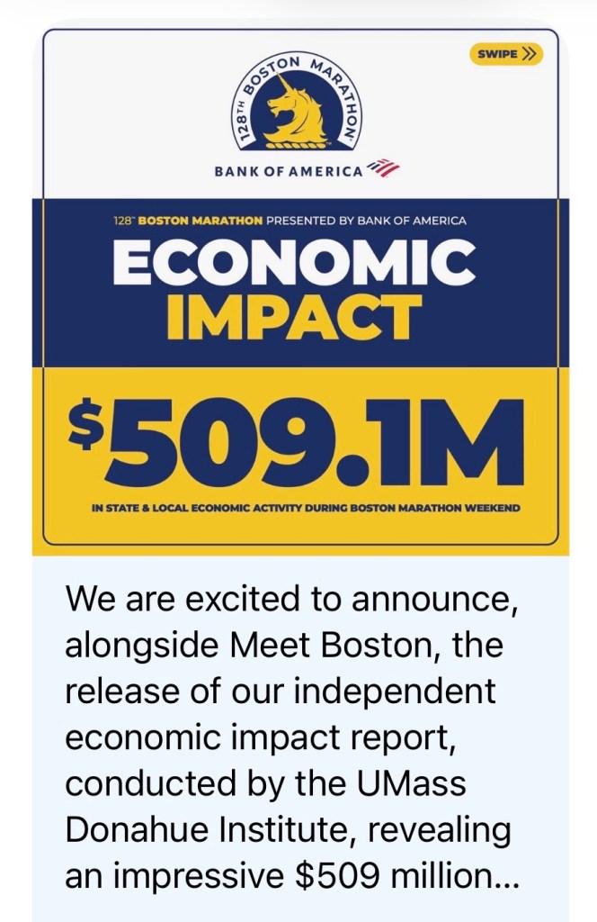 In November 2024, the Boston Athletic Association released its own economic impact study from the 128th Boston Marathon. The race drew 33,000 applications, with 29,333 runners accepted and 26,495 starters. The B.A.A. 5K added roughly 10,000 participants. Combined, the weekend generated $509 million in economic impact.