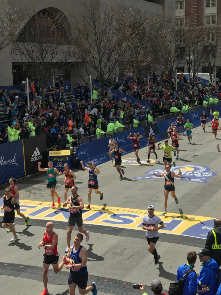 Boston Marathon finish line, Boylston Street. Clock: 2:56:47. Every finisher their own story.